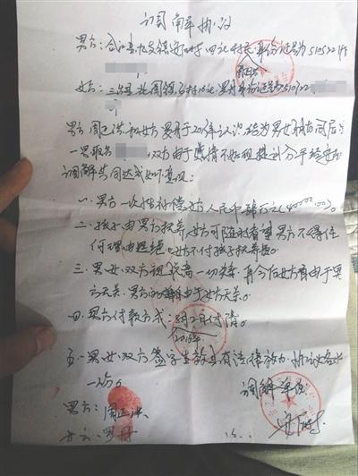 8月2日上午,周正洪家所在的九支鎮安居村委會對此事進行了調解,雙方達成了調解協議。協議稱,男方周正洪和女方羅丹于2013年認識,結為男女朋友同居,生有一男。雙方由于感情不好現提議分手,經調解達成如下意見:一、男方一次性補償女方4萬元;二、孩子由男方撫養,女方可隨時看望,男方不得以任何理由拒絕,女方不付孩子撫養費;三、男女雙方脫離一切關係。