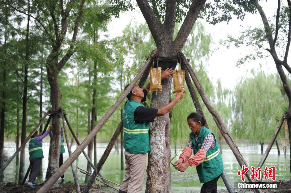 8月4日,工人在給被淹過的樹木吊施營養平衡液。自6月中旬以來,安徽合肥持續強降雨,導致洪澇災害嚴重,安徽合肥濱湖公園七千余棵樹木被水淹,災後合肥濱湖功能區針對公園現狀採取救護措施,預期成活率達百分之八十。中新社記者 張婭子 攝