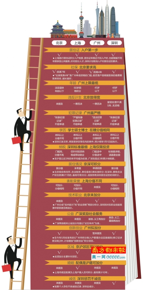 積分落戶政策是外來人口落戶當地的途徑之一,因與外來人口的醫療、保險及其子女的教育問題息息相關,積分落戶政策廣受關注。梳理北上廣深四地的積分落戶政策,南都記者發現,除了對居住證的硬性要求,四地的政策各有特色。