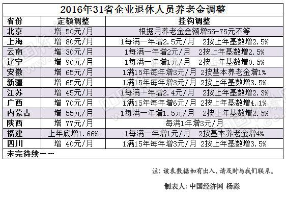 以雲南為例,繳費年限每滿一年每人每月增加2元,再按本人2015年12月基本養老金的2.5%增加調整。安徽規定,繳費年限滿15年後滿一年每人每月增加3元,再按本人2015年12月基本養老金的1%增加調整。中國經濟網統計,已公布方案省份,大多以此進行挂鉤調整。
