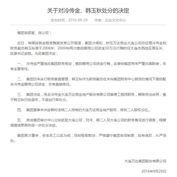 聲明內容稱:近日,有媒體就金程受賄案發表公開報道,集團才得知,時任萬達商業大連公司總經理冷傳金和財務副總韓玉秋曾于2008年、2009年兩次擅自挪用公司資金30萬元行賄時任大連市西崗區原區長、區委書記金程。為此集團決定: