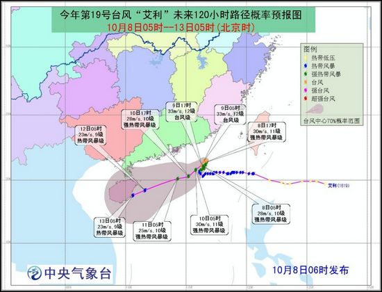 預計,10日白天以前,“艾利”將在南海北部海面徘徊少動,強度維持或略有增強,最強可達臺風級(12級,33∼35米/秒);10日以後將向西偏南方向移動,逐漸向海南島東部到廣東西部一帶沿海靠近,強度緩慢減弱。