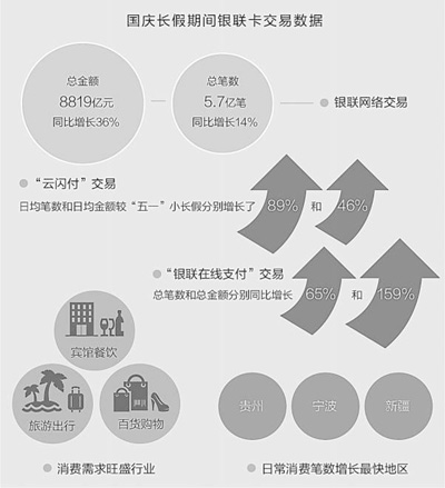 從消費結構來看,國慶期間銀行卡日常類消費仍保持較高增速,賓館餐飲、旅遊出行和百貨購物等行業的消費需求較為旺盛。貴州、寧波和新疆地區是今年國慶黃金周日常消費筆數增長最快的地區,較去年同期增幅均超過50%。