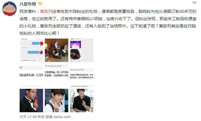 騰訊娛樂訊 10月13日晚,微博賬號“八哥專用”接到網友爆料稱,黃致列經常收到內地粉絲的禮物,通常都是貴重物品,粉絲為他從德國訂制40多萬的話筒,他立刻就用了。還有特供香煙和LV項鏈,也高興收下了。但粉絲發現,那些手工制品和便宜的小禮物,黃致列全部扔在了酒店,還有人拍到了當場照片。