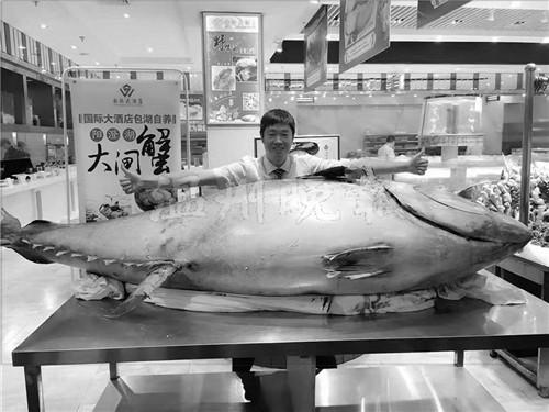 不久前,馬雲豪擲38888元拍下136斤的日本藍鰭金槍魚,宴請阿里巴巴員工吃生魚片。昨天,樂清國際大酒店出現了一條重達715斤、長約2.5米的藍鰭金槍魚。酒店董事長盧啟旺說,這條藍鰭金槍魚市場價在300萬元左右,最貴的一塊腮幫子肉每兩售價3800元。據悉,迄今為止,在國內也罕見如此大的藍鰭金槍魚。