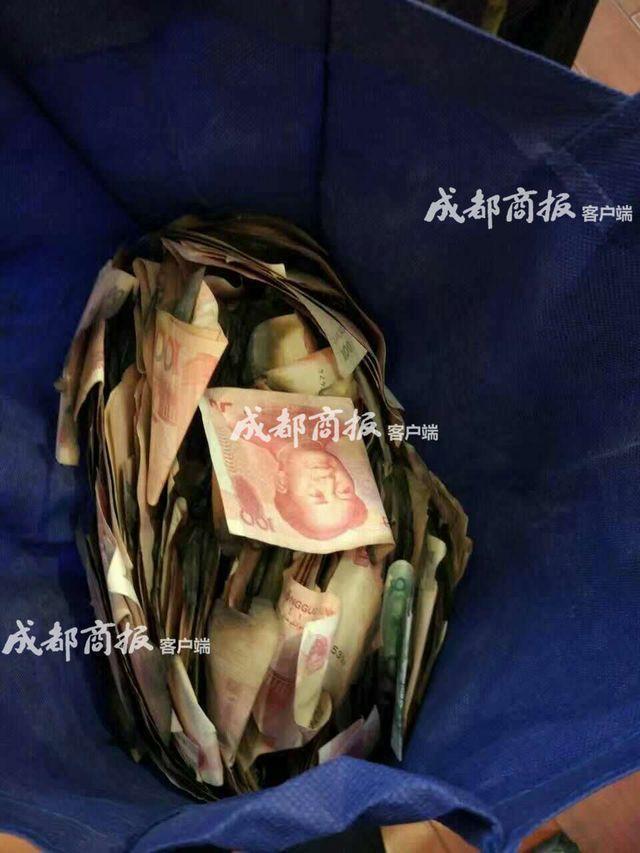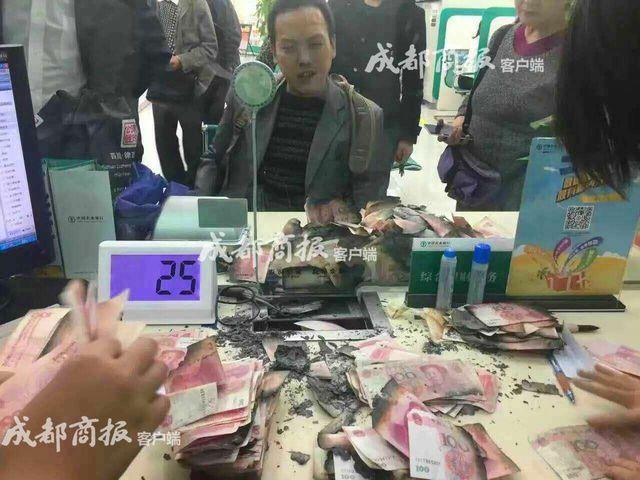 10月31日上午,市民張先生拎著兩個口袋到了成都光榮小區社區。他向工作人員展示了袋子中被燒損的現金,並稱有10萬元。下午2時許,中國農業銀行金牛支行的4名工作人員開始“搶救”這堆現金,直到晚上9時許,61900元現金才最終搶救出來。張先生介紹,錢是母親燒的。由于患有精神疾病,母親在事發後已被送往醫院治療。