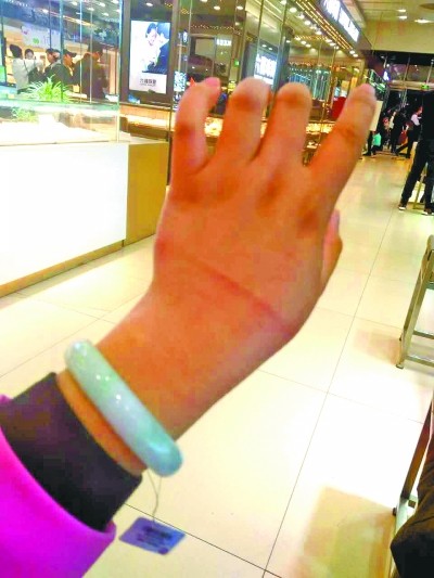 楊女士說,10月30日下午2點多,她和朋友一起去江漢路新世紀百貨鼎昌珠寶專櫃試戴了一個標價為32800元的翡翠手鐲。當時店員說這個手鐲打折做活動,只要6000多元,喜歡可以試戴,楊女士就將手鐲戴在左手上欣賞,結果手鐲取不下來了,從下午3點多鐘到5點39分,反復試了兩個多小時後,她的手掌都腫了,手鐲還是取不下來。店員說她可以不經過商場,直接把錢交給櫃臺,由櫃臺開收據後她把手鐲拿走,手鐲取下來後可以退貨退款。雙方討價還價,將手鐲價格定在4000元。擔心把錢直接交給櫃臺,取下手鐲後退貨櫃臺不認賬,楊女士提出想由商場開發票,櫃員稱那就必須將手鐲的吊牌剪掉,她取下來後還是能來退貨。雙方經過反復協商,最終楊女士刷卡消費了4000元,並“戴”走了手鐲。11月3日,待手消腫後,楊女士請人用洗衣液、肥皂水涂在鐲子和手臂、手掌上,終于順利將手鐲取出,當時非常激動。昨天上午,楊女士和朋友興奮地拿著手鐲和商場發票來退貨,櫃臺卻不願意退貨了。于是,向本報新聞熱線求助。