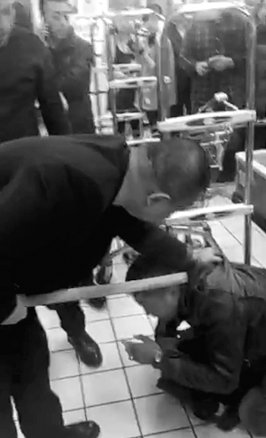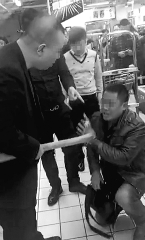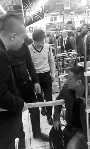 昨天,一段視頻在網上被熱議。“再不松開把你腿削折了”,一棕色外套男子被逼跪在地上,抱著收銀臺附近的欄桿連連承諾“再不來了”。另外兩個大漢在旁拖拽他,其中一人用木棒打向男子,另一人在旁邊踢了該男子一腳,並威脅道:“再來讓你沒命”(如圖)。