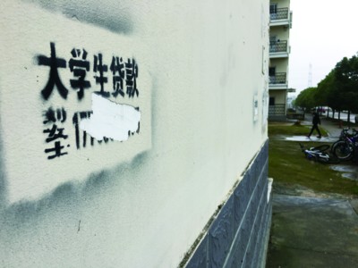 11月20日上午,安徽商報記來到小林所在的學校探訪,走進校園,左手邊不遠處就是一棟棟學生宿舍樓,記者注意到,宿舍樓靠近校園主幹道的一側牆體上,隨處可見那種噴繪上去的校園貸小廣告,內容都非常簡陋,只寫了“大學生貸款”寥寥數字,下面是聯係人姓氏和電話。記者走訪了多棟宿舍樓,不少宿舍樓的牆體顯眼位置,都有這樣的校園貸款廣告。