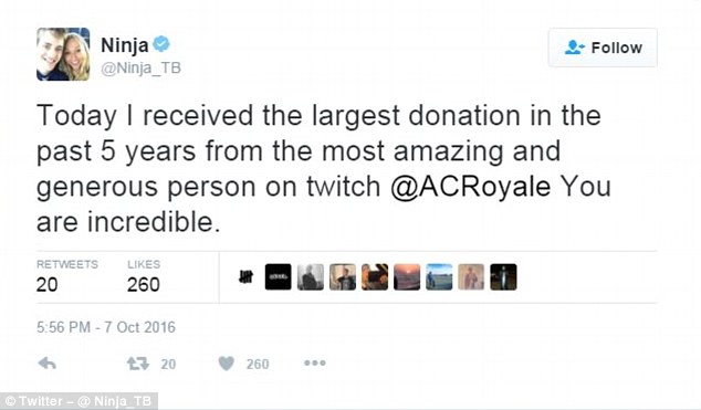 畫面顯示,遊戲主播Ninja在收到這筆錢時顯得十分震驚。他說:“今天是我五年來收到打賞額度最高的一次,感謝慷慨的觀眾@ACRoyale,這太不可思議了!”
