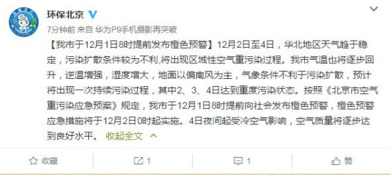 按照《北京市空氣重污染應急預案》規定,北京市于12月1日8時提前向社會發布橙色預警,橙色預警應急措施將于12月2日0時起實施。4日夜間起受冷空氣影響,空氣質量將逐步達到良好水平。