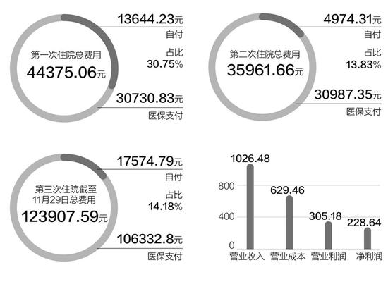 該文件顯示,第一次住院總費用44375.06元,其中醫保支付30730.83元,自付13644.23元,自付比例為30.75%;第二次住院總費用35961.66元,其中醫保支付30987.35元,自付4974.31元,自付比例為13.83%;第三次住院截至11月29日總費用123907.59元,其中醫保支付106332.8元,自付17574.79元,自付比例為14.18%。前兩次住院的醫保及自付費用均已結清,第三次費用將于出院時結算。
