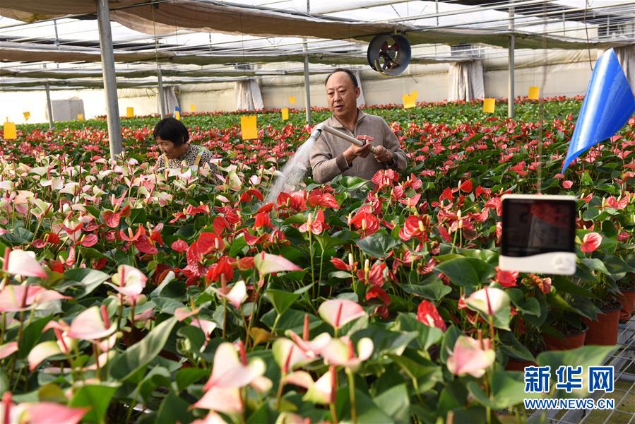 12月6日,劉國臻(右)在“智能花卉溫室”為紅掌澆水。新華社記者 范長國攝