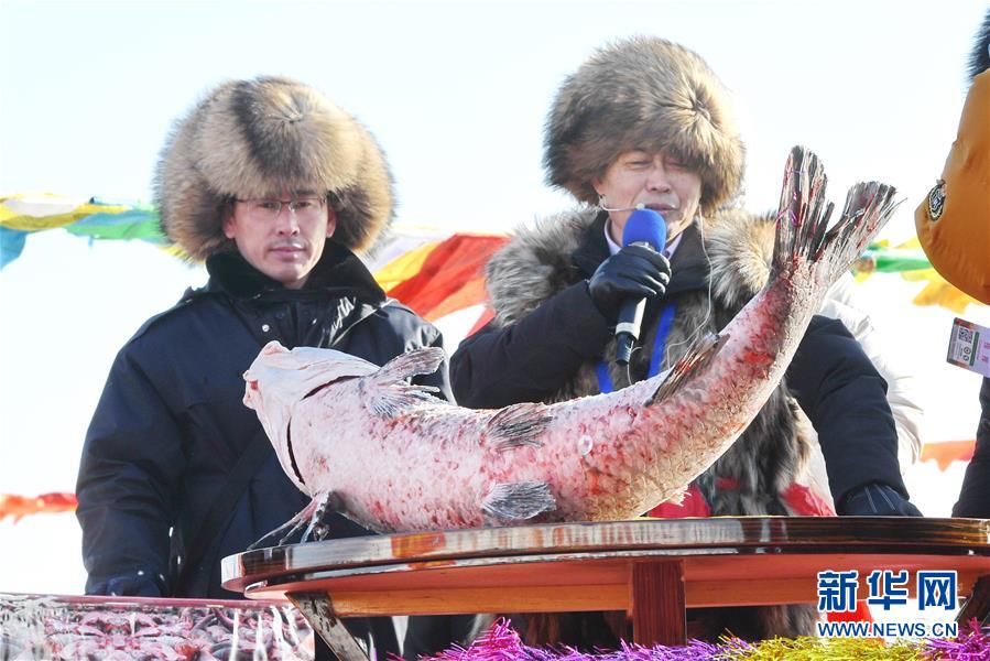 12月28日,拍賣師主持頭魚拍賣儀式。當日,2016年中國松原查幹湖第十五屆冰雪漁獵文化節正式開幕。在頭魚拍賣儀式上,一條重達50余斤的“明星魚”拍出了85萬元人民幣的高價,成為查幹湖冬捕歷年來價格最高的頭魚。新華社記者張楠攝