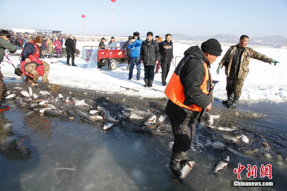 1月4日,遼寧省撫順縣,冬季捕魚。當日的撫順縣首屆冬捕節在石文鎮英守水庫舉行,撈出了5萬余斤活魚。現場選出5條最大的魚身披大紅花,被起名為“年年有余”“紅紅火火”“財源滾滾”“福星高照”“闔家幸福”。十幾人參與競拍,最終頭魚以9.8萬元的價格拍出。中新社記者 沈殿成 攝