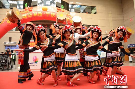 資料圖:廣西鐵警給旅客表演文藝節目,提醒注意安全。 吳春麗 攝