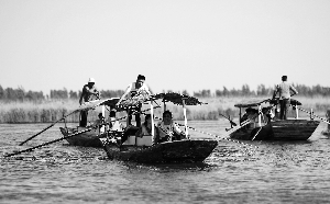 在安新縣安州鎮東向陽村,蜿蜒的府河流經村莊,匯入白洋淀。白鷺在水面振翅低飛,村民在河里撈蓮藕。