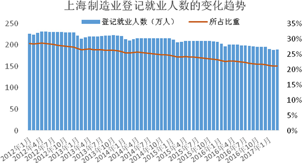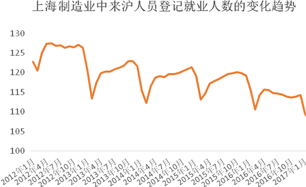 2017年3月,制造業登記就業人數中的外省市來滬人員共110.3萬人,與五年前同期相比減少14.8萬人,下降幅度為11.8%。