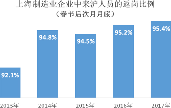 統計數據顯示,上海制造業登記就業人數中的外省市來滬人員,95.4%在2017年春節後的第二個月底前返回上海繼續從事制造業生產。從近幾年的變化來看,這一比例總體保持上升趨勢,這表明外省市來滬人員節後回流的速度在加快,春節因素對制造業穩定生產的影響有所降低。