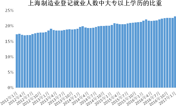 2017年3月,上海制造業登記就業人員中,大專以上學歷的約佔23.0%,同比上升1.2個百分點,與五年前同期水平相比上升5.8個百分點,近年來總體呈現上揚趨勢。這表明上海制造業企業吸引了越來越多的高學歷勞動者,從業人員的素質不斷提高。