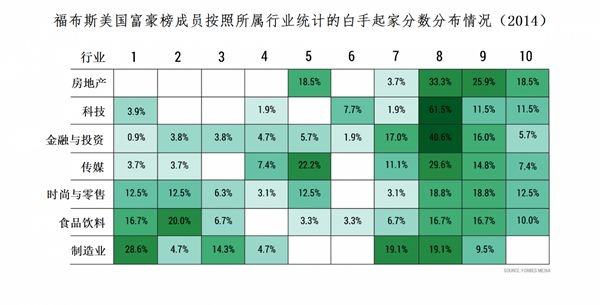 科技行業是白手起家型億萬富豪最為集中的領域,這一點並不令人意外。在對最新發布的福布斯美國富豪榜的數據進行分析之後,我們發現,科技行業94%以上的億萬富豪是自己創造財富的。不過,其中絕大多數——準確地說是61.54%——確實得到了一些幫助:他們生長在中上階層家庭,這意味著他們不必在與命運進行一番抗爭之後,才能為自己在美國富豪榜上贏得一席之地。而戰勝命運的勇士大多是房地產億萬富豪——他們當中有將近一半的人出生于貧窮或中下階層家庭。