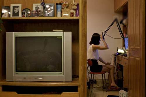 10來平米的臥室既是睡覺之處也是工作場所。瀅瀅在虛擬世界里自稱小Y,現實生活中是一個80後北京姑娘,身材瘦小,面容姣好,在藝校學過唱歌,參加過2005年超級女聲,在一部穿越電影里演過西施。她以前是一名酒吧駐唱歌手,來YY做主播不久。