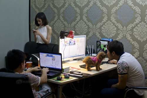 2014年8月27日,因工作需求,隔一段時間瀅瀅就會去幾次公司做相關線上的活動,瀅瀅正在一旁等待線上活動的開始。小狗是她最親密的夥伴,這些天不論到哪都帶著它一起。
