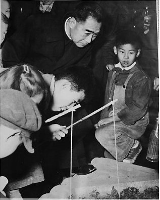 總理的關愛(在周總理前面做釣魚遊戲者為羅援)。