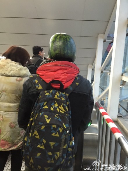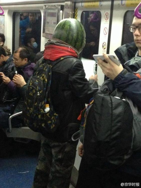 北京地鐵現"西瓜哥" 頭套西瓜皮手持酒瓶