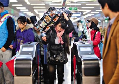 2月4日,北京西站北廣場,幾名乘客走出地鐵閘口。昨日,北京各火車站發送旅客已突破40萬人。 新京報實習生 彭子洋 攝