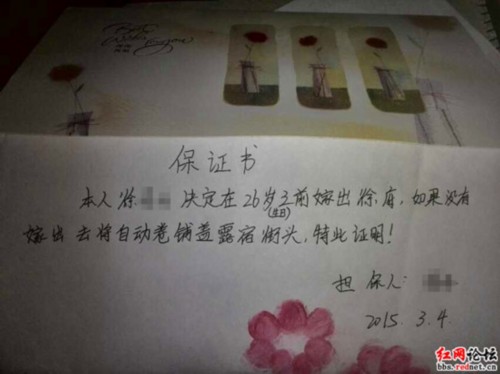 摘要:【26歲不嫁露宿街頭女子被逼婚寫保證書吐槽】春節假期已經結束,上班族開啟了上班模式,但春節期間的那場“戰爭”——相親,卻讓剩男剩女們心有余悸。3月5日,有網友在紅網論壇以《常德一美女寫保證書要嫁出去不然就睡馬路》為題,曬出了一張保證書,吐槽自己成為“被催婚”族的苦惱和無奈。