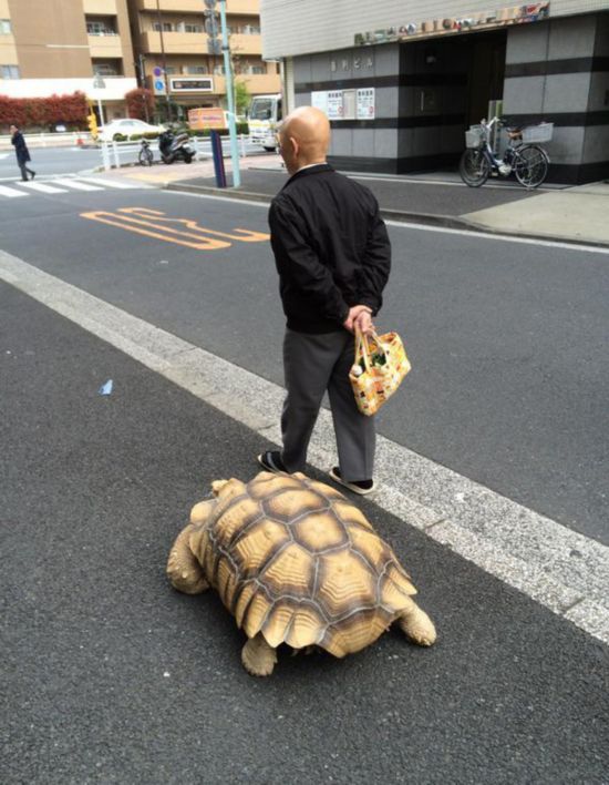 據楚天都市報報道,在東京月島的商業街上,經常會看到一個老爺爺在溜大烏龜——沒錯,是在遛烏龜……偶爾龜背上還會坐著小孩子。