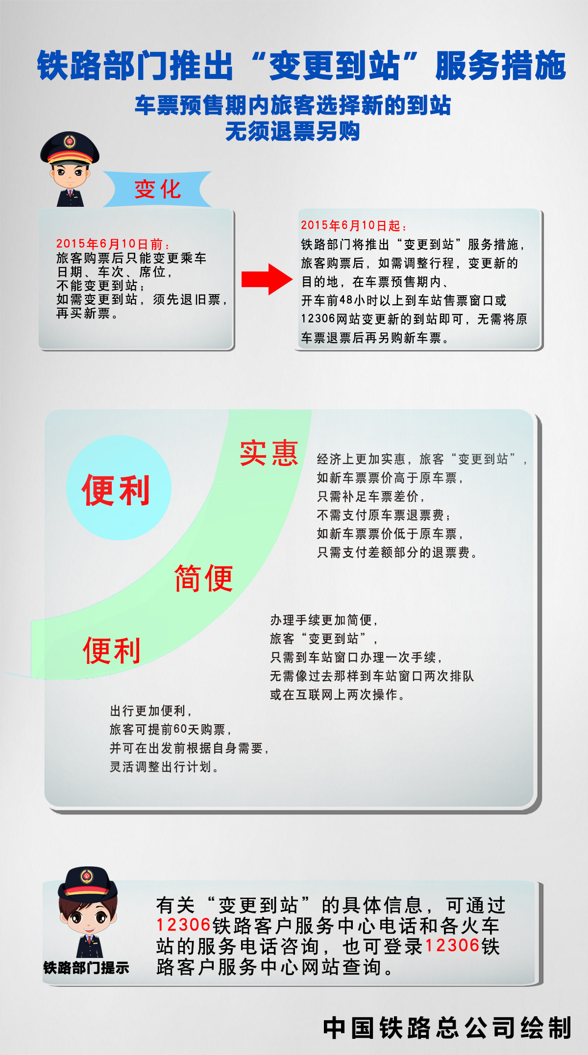 記者從鐵路部門獲悉,為滿足旅客變更行程的需求,2015年6月10日起,鐵路部門將推出“變更到站”服務措施,旅客購票後,如需調整行程,變更新的目的地,在車票預售期內、開車前48小時以上到車站售票窗口或12306網站變更新的到站即可,無需將原車票退票後再另購新車票。