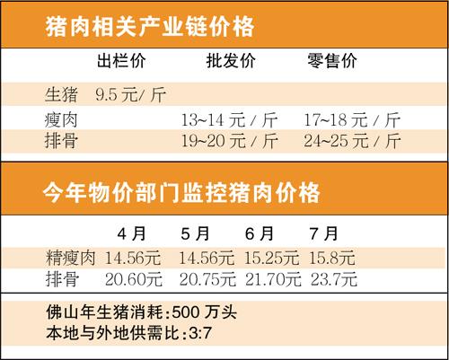 記者了解到,目前佛山生豬年需求量約為500萬頭,其中佛山本地年出欄量150萬頭,佔近30%。“目前,佛山市面銷售的豬肉近7成從江門、肇慶、湖南等地養殖場運輸而來。”市農業局畜牧科相關負責人稱,在整體市場供求關係相對偏緊的情況下,豬肉價格隨行就市,水漲船高。