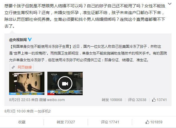 事情是這樣的:8月2日晚間,央視新聞發微博稱,我國單身女性不能使用冷凍卵子生育,“我國衛生部規定,單身女性不能實施輔助生殖技術的相關手術。有的醫院允許單身女性冷凍卵子,但在使用冷凍卵子時必須提供三證:即身份證、結婚證、準生證。”