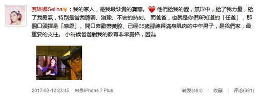 近日,Selina爸爸作為“被感恩對象”,參與錄制浙江衛視《熟悉的味道2》,3月12日,Selina深夜發長文感謝父親:“爸爸是我永遠的避風港。”Selina在微博上坦言自己小時候由于父親對她的教育非常嚴格,造成心里的不平衡,兩人的距離越來越遠。