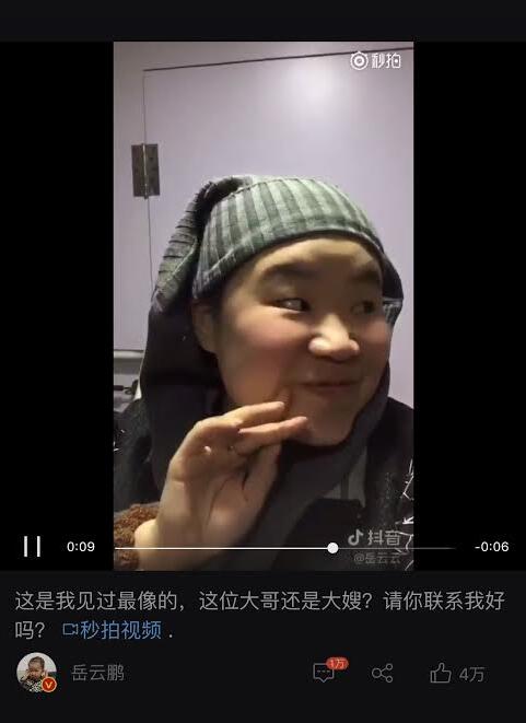 3月13日晚,岳雲鵬發布了一條尋人微博,並附上一段視頻,稱“這是我見過最像的,這位大哥還是大嫂?請你聯係我好嗎?”微博底下一水的評論都在調侃小岳岳,“這難道不就是你”“不要用你自己的視頻忽悠我”,由此可見小岳岳和正在尋找的這位視頻中人相似程度有多高。