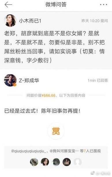 有網友在微博給鄭爽爸爸提問:“胡彥斌到底是不是你女婿?”鄭爽爸爸回答幹脆,“已經是過去時,陳年舊事勿再提。”