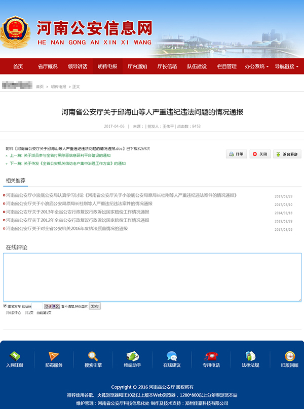 河南公安信息網發布《河南省公安廳關于邱海山等人嚴重違紀違法問題的情況通報》截圖