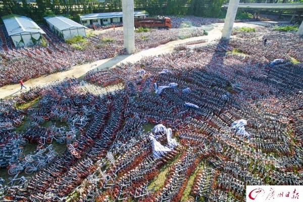 2017年4月15日報道,廣州市海珠區新洲立交下有一個摩拜單車的運輸中轉站,成千上萬部共享單車在這里停放,準備被運輸到城市各個角落。