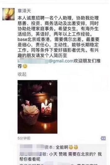 根據截圖顯示,章澤天對助理的要求為:希望是女生,有海外生活經歷,英語好,兩年以上工作經驗,最重要的是細心、責任心、主動性,能夠長期穩定工作,同等條件下愛好攝影者優先。而助理負責的主要事物為:處理慈善、投資、商務活動及出差安排,同時協助處理家庭事務。