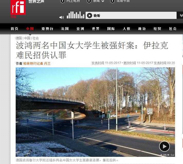 據《西部報》報道,一位伊拉克難民被指控在魯爾大學附近強姦了兩名中國女大學生。這位難民和妻子及兩個孩子住在波鴻難民營一個集裝箱房里。去年8月,一位中國交換生在從超市回家的路上,突然被一男子拽進路邊小樹林里強姦。三個月後,這位暴徒再次出手,強姦對象又是一位中國女留學生。“大學強姦者”的稱號于是不脛而走,並引發周邊恐懼。警方追蹤線索,追到了難民營。