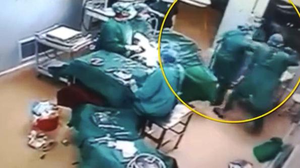 河南兩醫護人員手術室互毆。視頻截圖記者獲得的一段視頻顯示,兩名醫護人員在醫院的手術室內先是發生口角,隨後互相毆打起來,其中1人連出7拳,在場其他醫務人員趕緊上前制止。視頻發布者稱,這一幕發生在河南蘭考縣的一家醫院內,互毆的是一名醫生和一名護士。