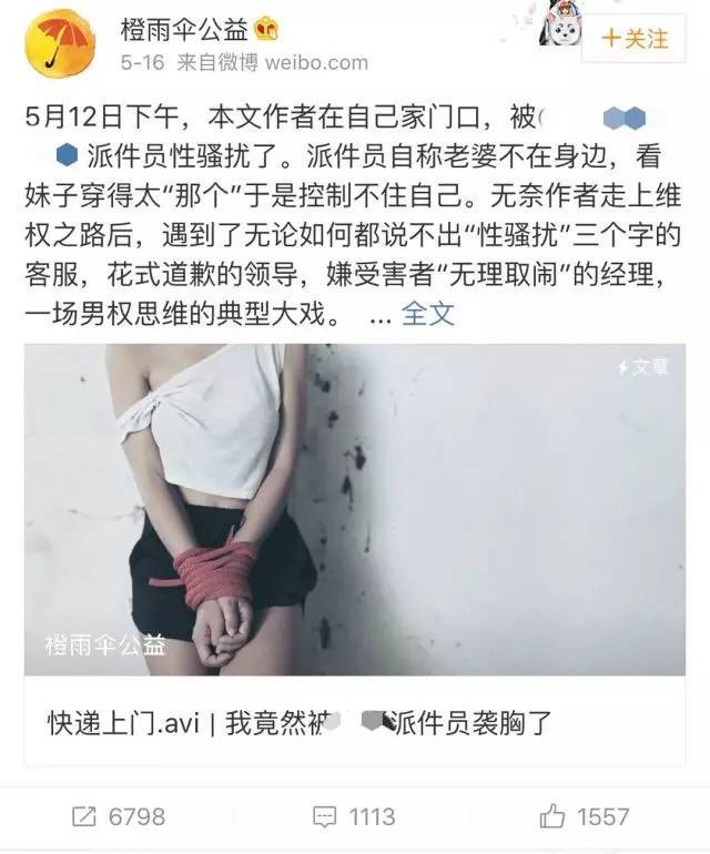 更令受害者氣憤的是,那快遞員還表示受害者的穿著,也是導致他“衝動”的原因。這等于是在說被性騷擾的這位姑娘自己也有錯……