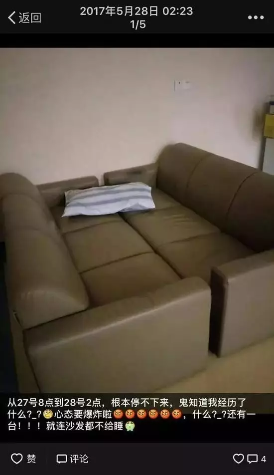 今年5月,陳醫生的朋友圈,發自淩晨2點23分:從27號8點到28號2點,根本停不下來,鬼知道我經歷了什麼,心態要爆炸了,什麼??還有一臺!!!就連沙發都不給睡。