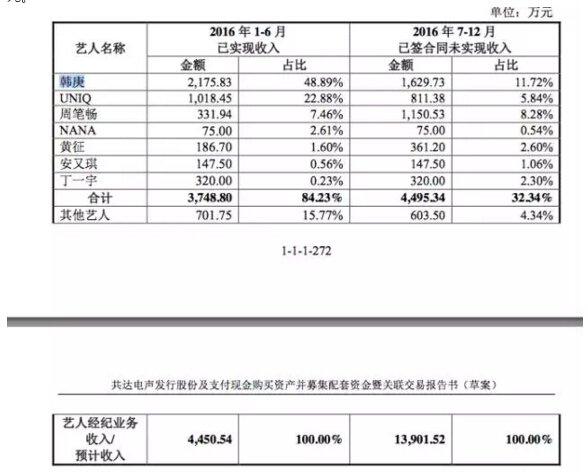 其中,韓庚是樂華文化旗下最大的一棵“搖錢樹”。今年1—6月,韓庚已實現收入2175.83萬元,佔公司藝人業務總收入的49%;7—12月,已簽合同未實現收入的金額為1629.73萬元,合計3805萬元。