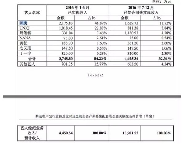 另外,韓庚也將從這次收購中獲得5080萬元。作為樂華文化旗下最賺錢的藝人,收購草案也披露了韓庚的“商業價值”:2016年可為公司帶來3800萬元的收入。