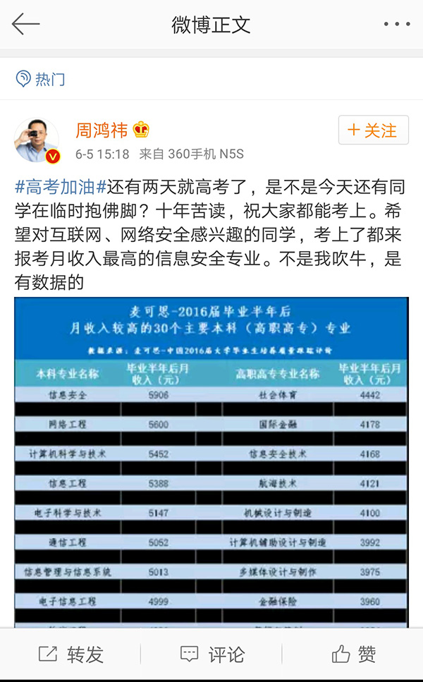 6月5日,周鴻祎在微博上發文,寄語考生的同時,還特意推薦了信息安全專業,“還有兩天就高考了,是不是今天還有同學在臨時抱佛腳?十年苦讀,祝大家都能考上。希望對互聯網、網絡安全感興趣的同學,考上了都來報考月收入最高的信息安全專業。不是我吹牛,是有數據的。”