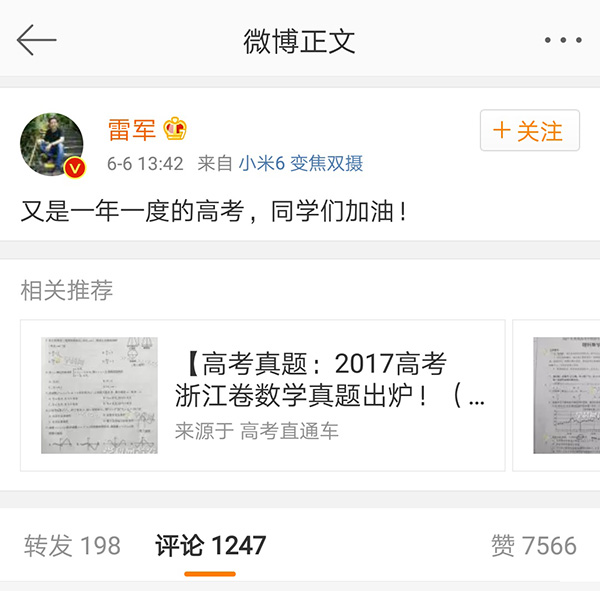 6月6日,雷軍在微博上為考生鼓勁,“又是一年一度的高考,同學們加油!”
