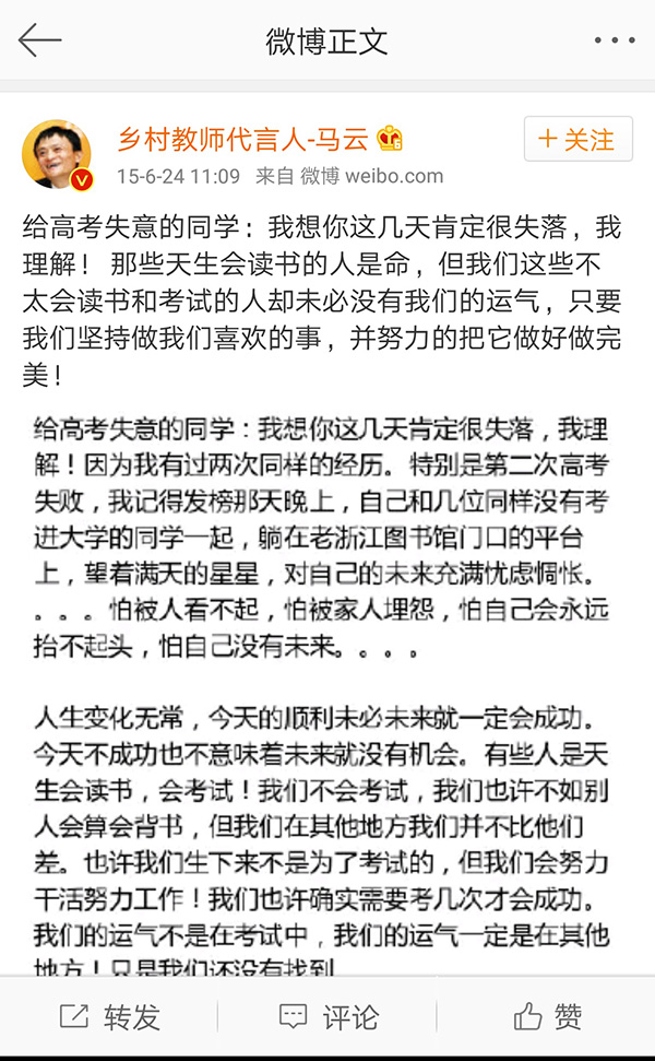 2015年高考後,馬雲在微博上給高考失意的同學鼓氣:我想你這幾天肯定很失落,我理解! 那些天生會讀書的人是命,但我們這些不太會讀書和考試的人卻未必沒有我們的運氣,只要我們堅持做我們喜歡的事,並努力的把它做好做完美!